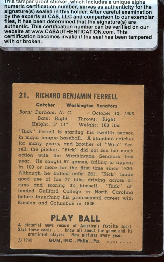 Rick Ferrell Signed 1940 Play Ball Card #21 - CAS Authentic