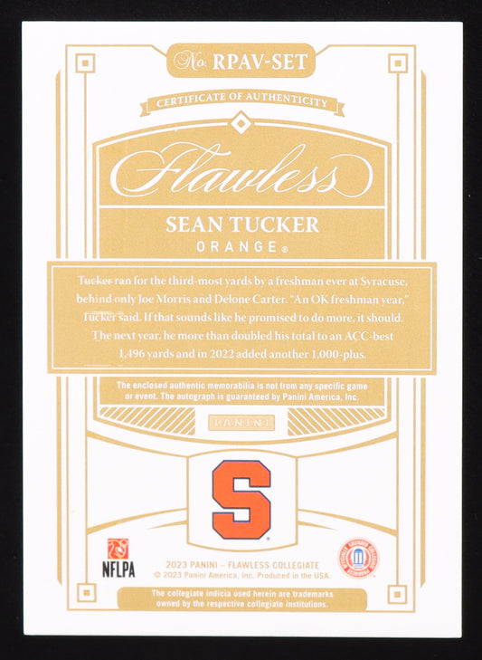 Sean Tucker 2023 Panini Flawless Collegiate Flawless Rookie Patch Autographs Vertical Platinum #145 RC #1/1 Rookie Card / Serially Numbered #1 / 1