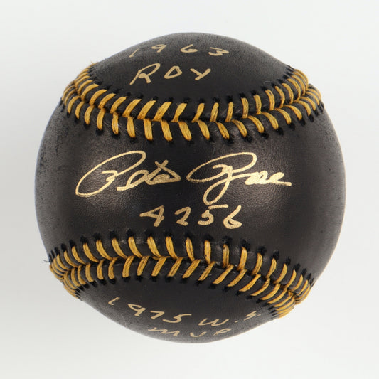 Pete Rose Signed OML Black Leather Baseball with Multiple Inscriptions & Display Case (PSA - Graded 10) Overall Grade 10 / Autograph Grade 10 / Baseball Grade 10