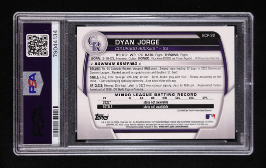 Dyan Jorge Signed 2023 Bowman Chrome Prospects Purple Refractors #BCP22 #176/250 RC (PSA 9 | Auto Grade PSA 10) Rookie Card | Serially Numbered #176 / 250 | Autograph Graded PSA 10