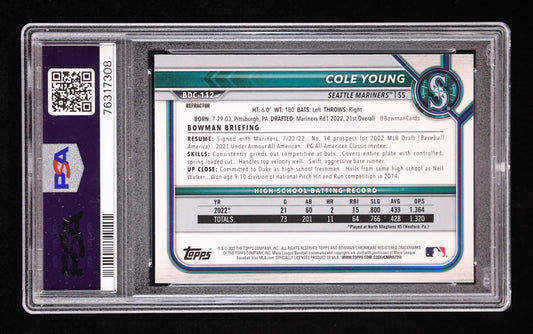 Cole Young Signed 2022 Bowman Chrome Draft Refractor #BDC112 RC (PSA 9 | Auto 10) Rookie Card | Autograph Graded 10