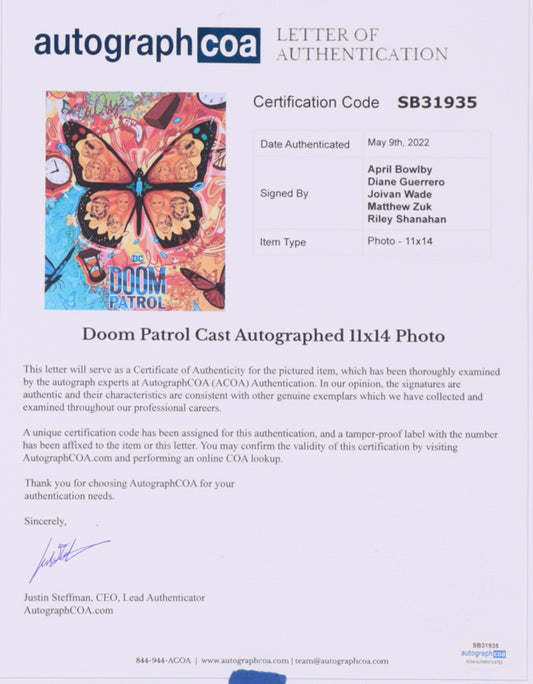 "Doom Patrol" 11x14 Photo Cast-Signed (ACOA) by (5) April Bowlby, Diane Guerrero, Joivan Wade, Matthew Zuk & Riley Shanahan with Inscriptions - Rita Farr / Crazy Jane / Cyborg / Negative Man / Robotman