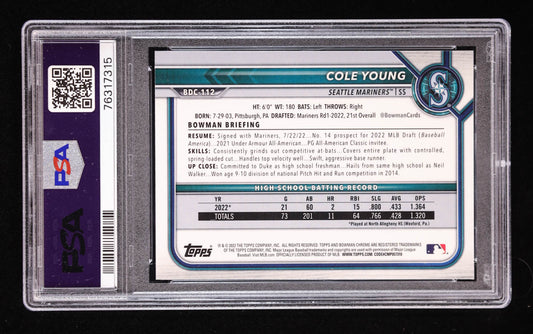 Cole Young Signed 2022 Bowman Chrome Draft #BDC112 RC (PSA 9 | Auto 10) Rookie Card | Autograph Graded 10