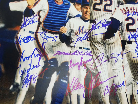 1986 Mets WS Champs Team Signed (JSA) – Doc Gooden, Darryl Strawberry, Ray Knight, Mookie Wilson & Others (26 Total) Signed 16×20 Photo (JSA COA)