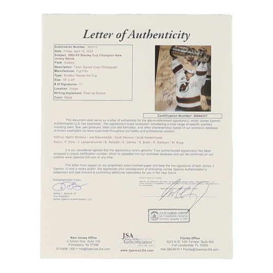 2002-03 Stanley Cup Champion Devils 16x20 (JSA) Photo Team-Signed by (17) with Martin Brodeur, Joe Nieuwendyk, Scott Stevens, Scott Niedermayer