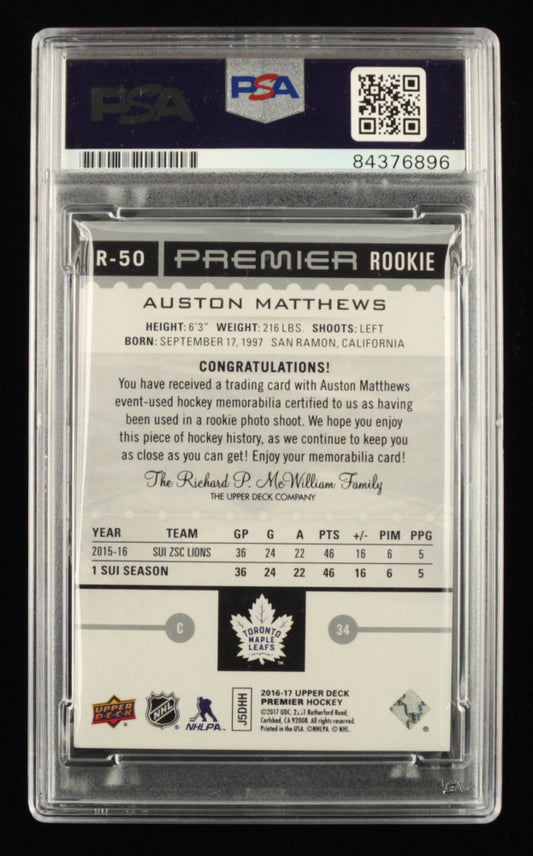 Auston Matthews Signed 2016-17 Upper Deck Premier Rookies Jerseys #R50 RC Inscribed "2017 Calder" - Rookie Card | Autograph Graded PSA 10