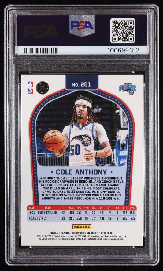 Cole Anthony Signed 2020-21 Panini Chronicles Marquee #251 RC (PSA 9 | Auto Graded PSA 10) Autograph Graded PSA 10 | Rookie Card
