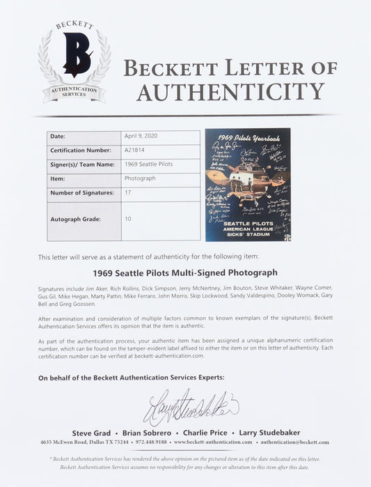 1969 Pilots 16x20 Photo Team-Signed (Beckett) by (17) with Jim Aker, Rich Rollins, Dick Simpson, Jerry McNertney with Multiple Inscriptions (Autograph Graded Beckett 10)