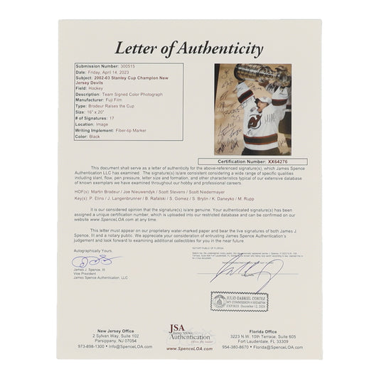 2002 Devils Stanley Cup Champions 16x20 Photo Team-Signed (JSA) By (17) With Martin Brodeur, Joe Nieuwendyk, Scott Stevens, Scott Niedermayer