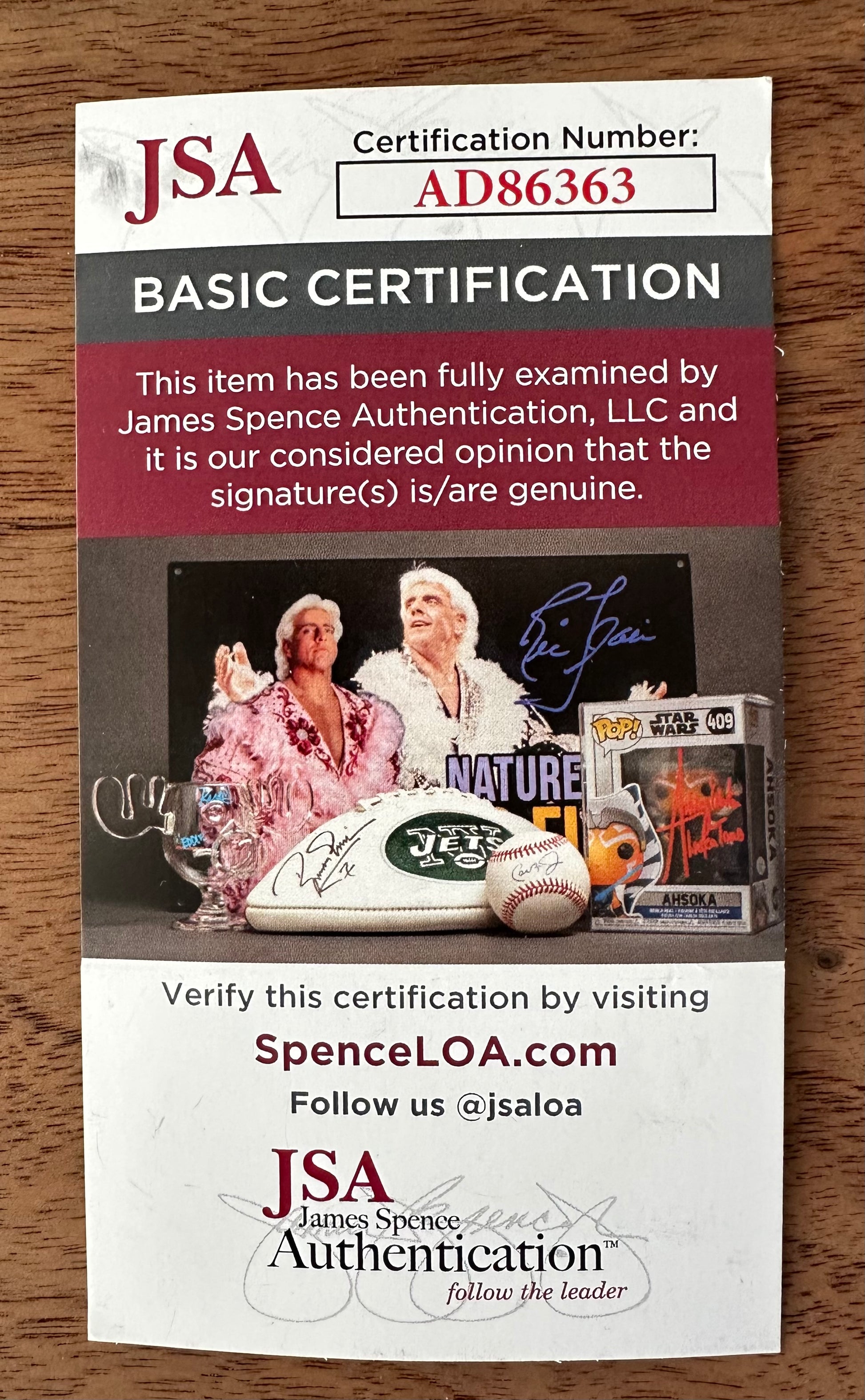 This autograph is certified by James Spence Authentication (JSA). It comes with the numbered hologram and matching Certificate of Authenticity.