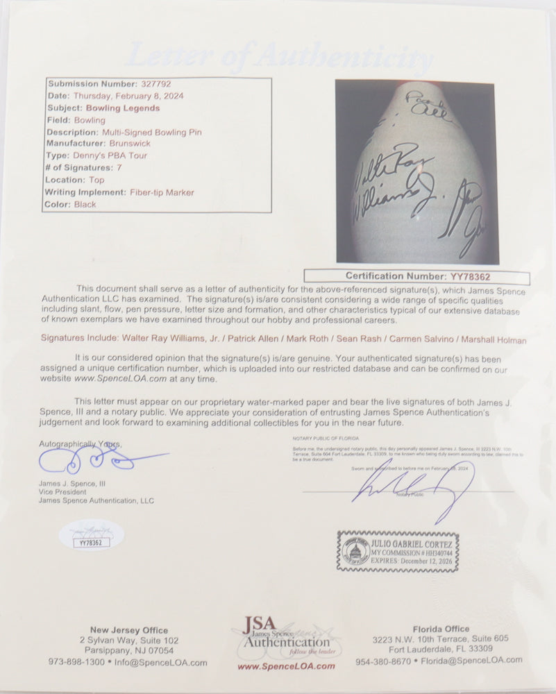 Denny's PBA Tour Full-Size Bowling pin has been hand-signed by (7) With Walter Ray Williams Jr., Patrick Allen, Mark Roth, Sean Rash, Carmen Salvino and Marshall Holman. Please note, there is staining on the pin.