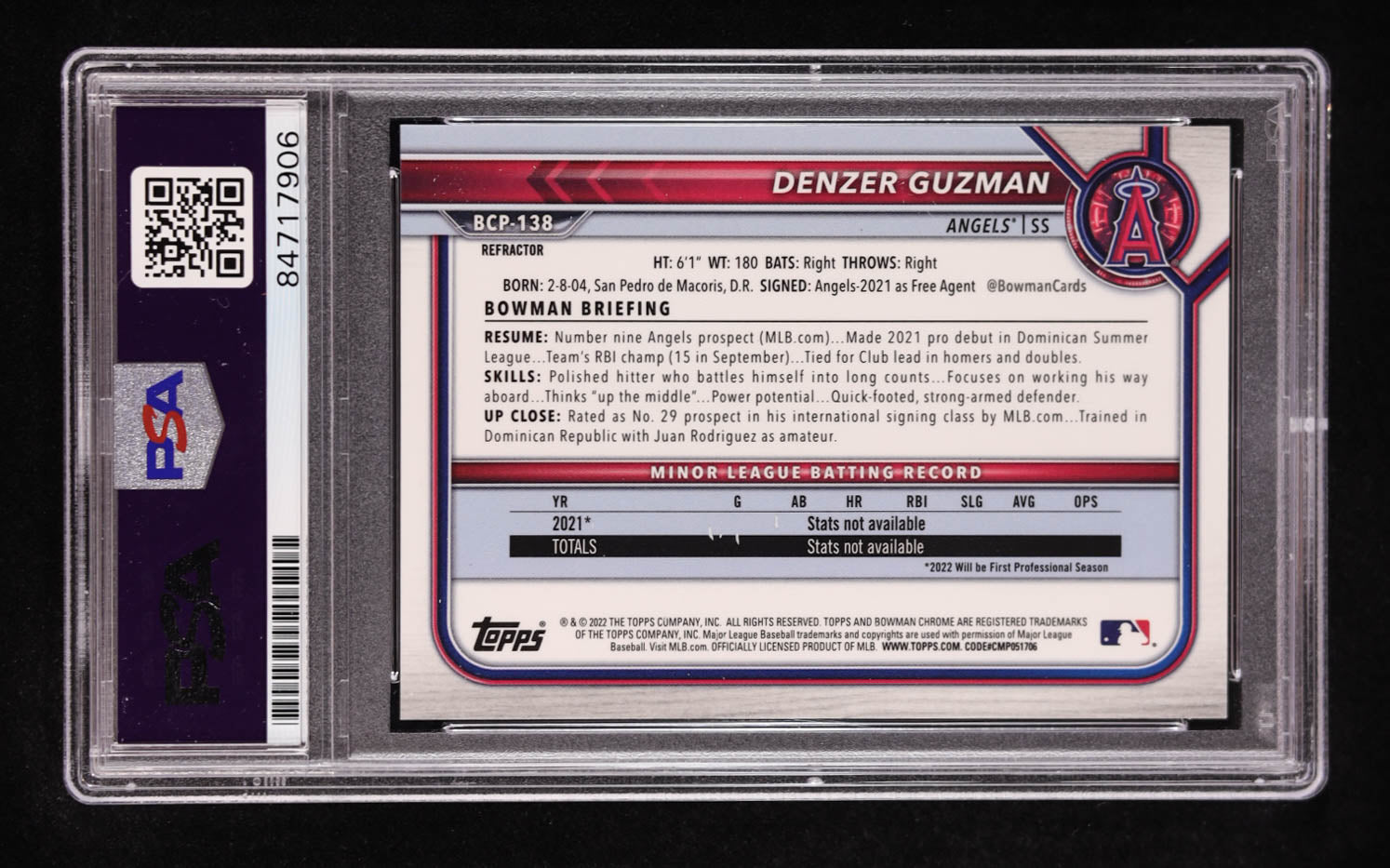 Denzer Guzman Signed 2022 Bowman Chrome Prospects Refractors #BCP138 #319/499 RC (PSA 10) Serially Numbered # 319 / 499 - Rookie Card