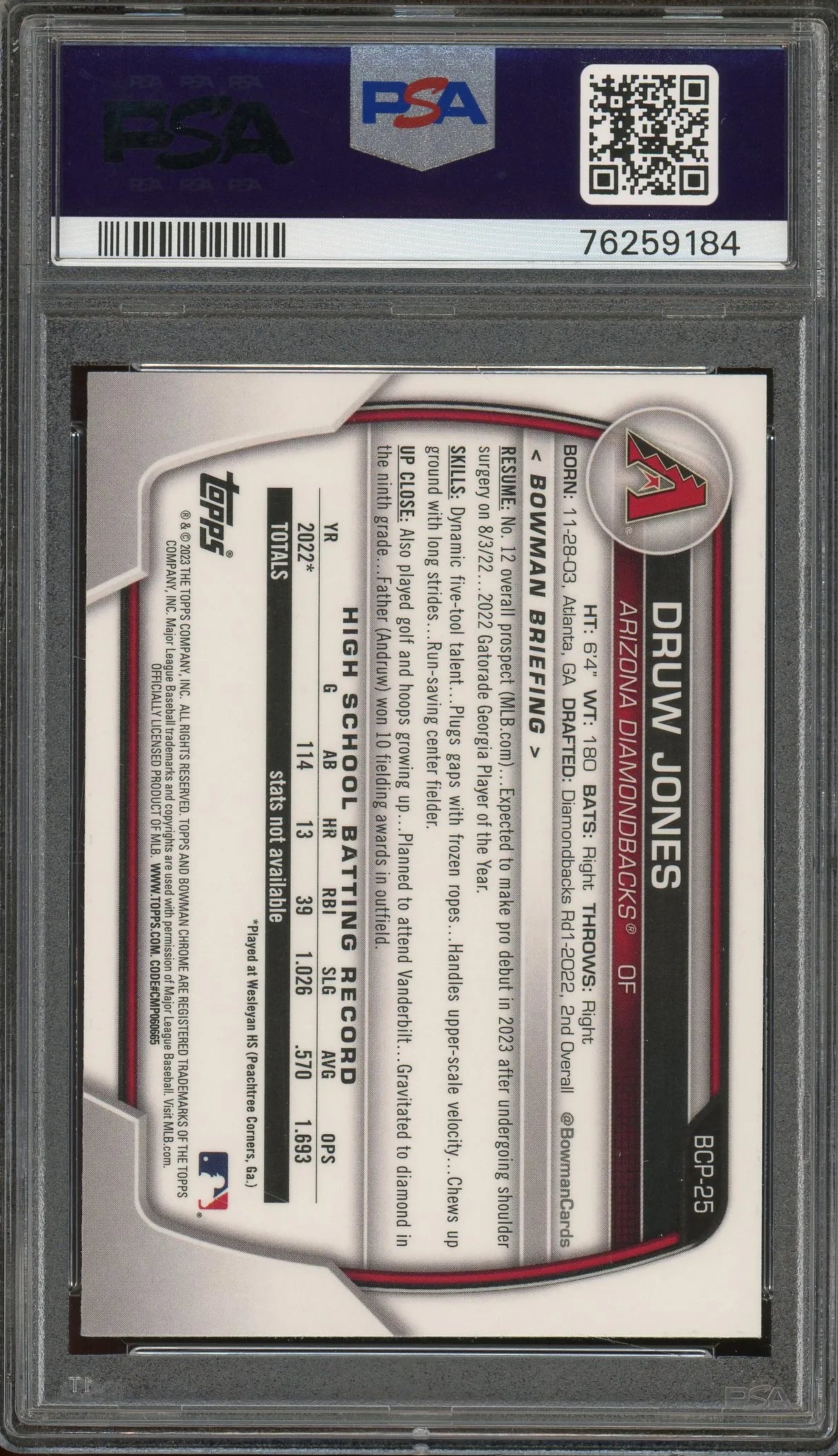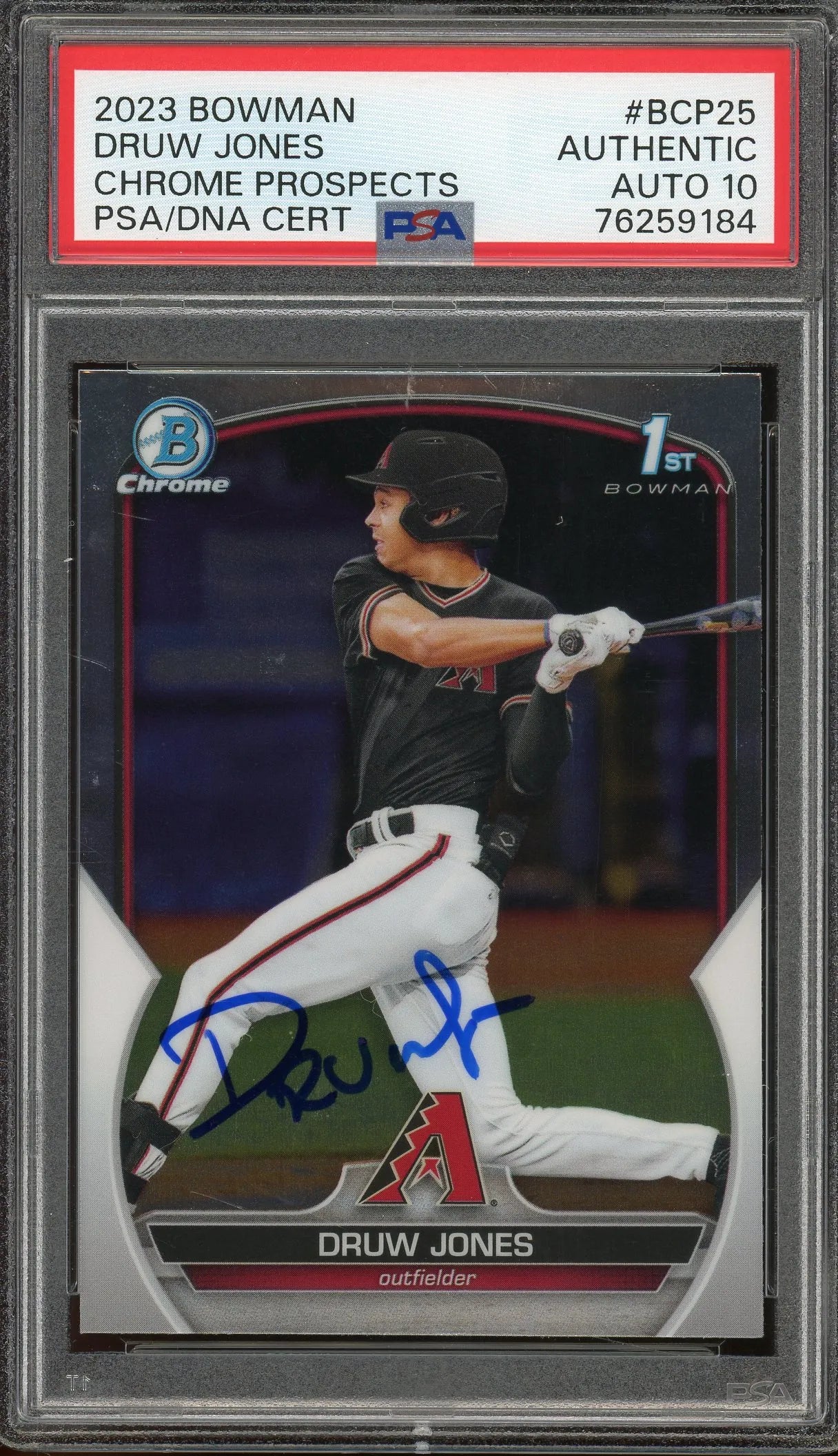 Druw Jones Signed 2023 Bowman Chrome Prospects 1st Bowman #BCP25 RC – Auto Graded 10 (PSA) - Rookie Card