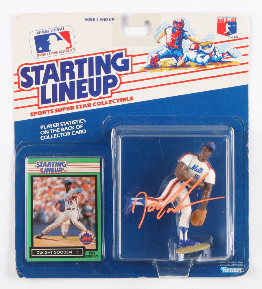 Starting Lineup action figure with trading card has been hand-signed on the packaging by Dwight Gooden (New York Mets).