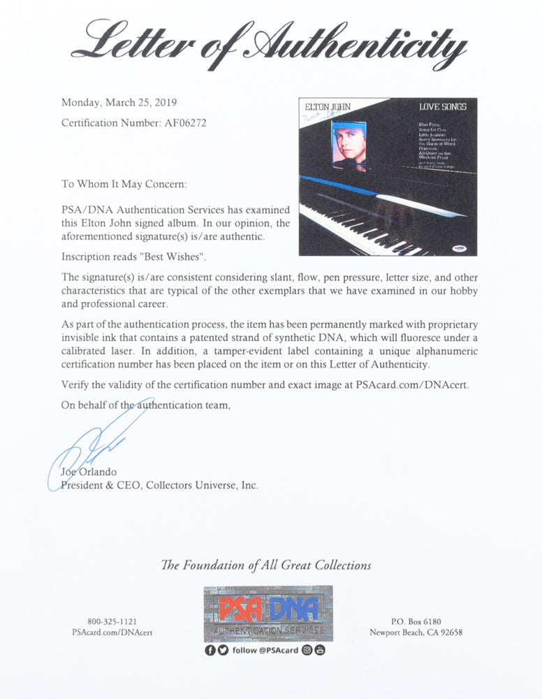 Elton John Signed (PSA) "Love Songs" Vinyl Record Album Inscribed "Best Wishes"