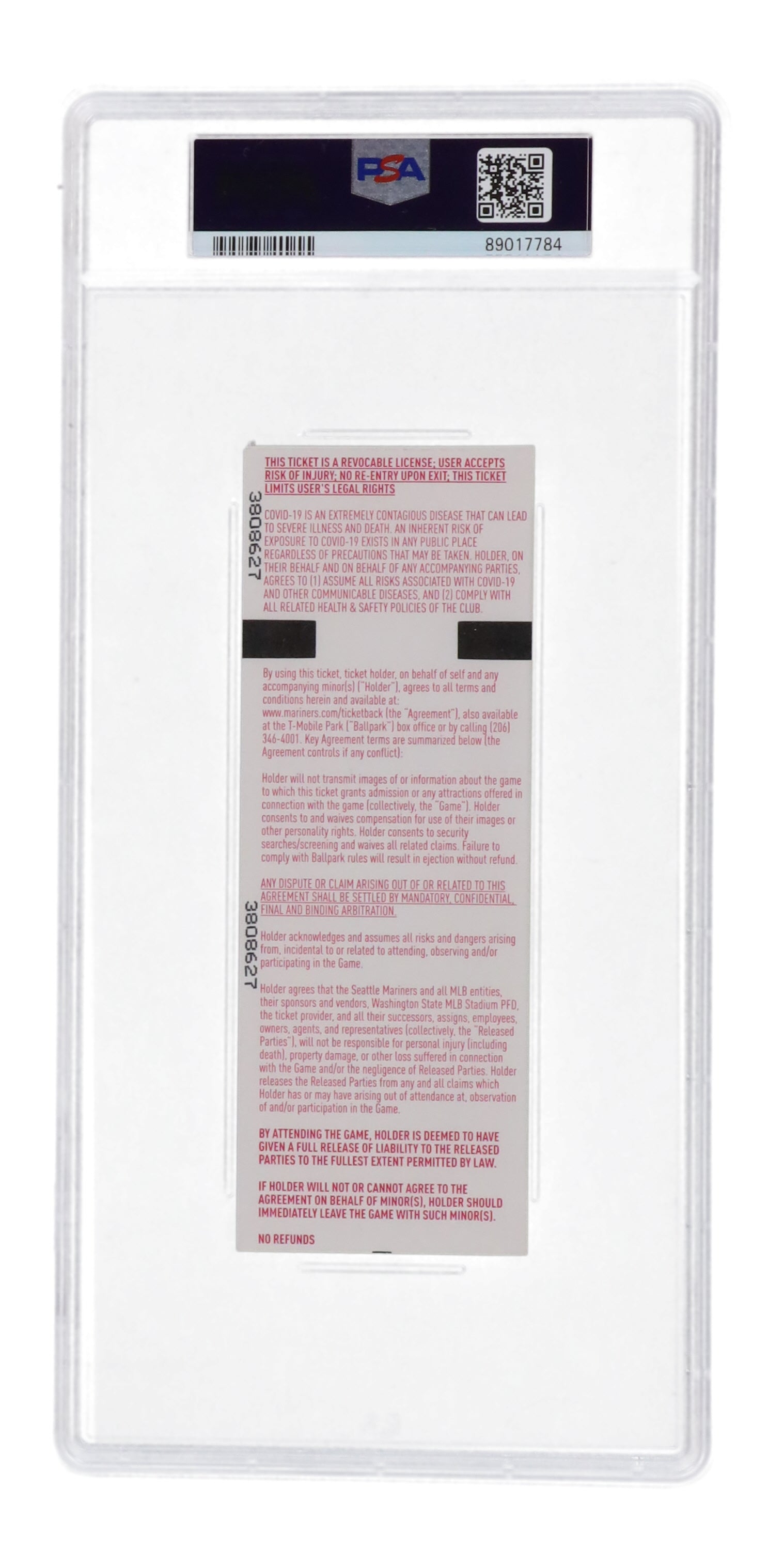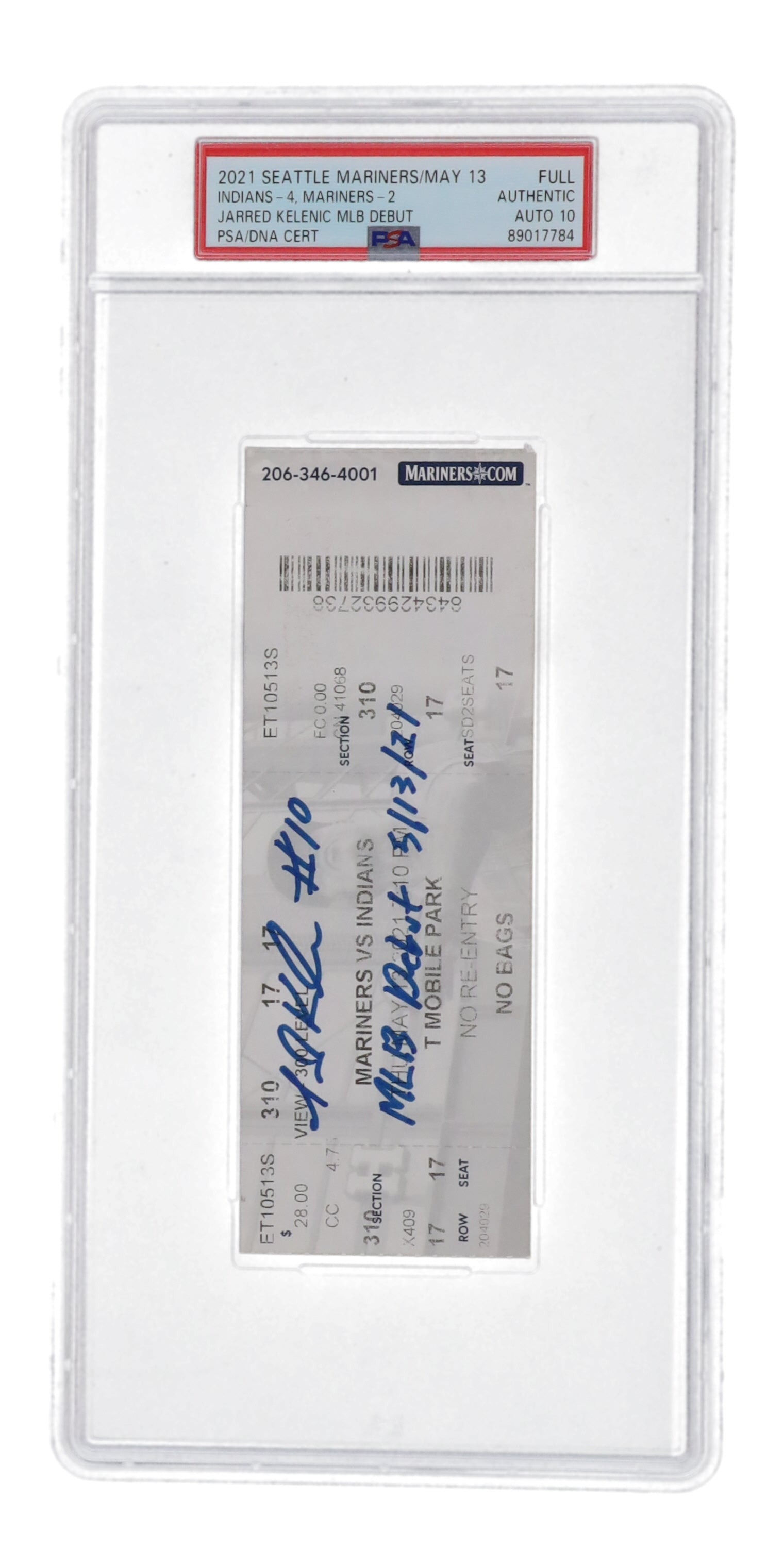 Seattle Mariners vs. Cleveland Indians ticket stub, dated May 13, 2021. Hand-signed and inscribed by Jarred Kelenic (Seattle Mariners). The ticket has been deemed authentic and the autograph has been graded PSA 10.