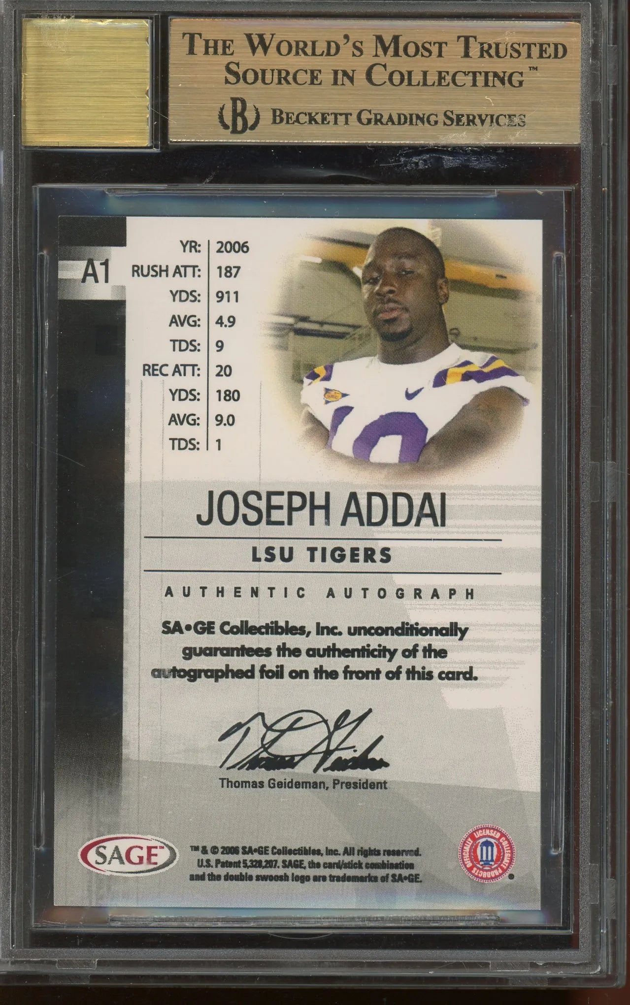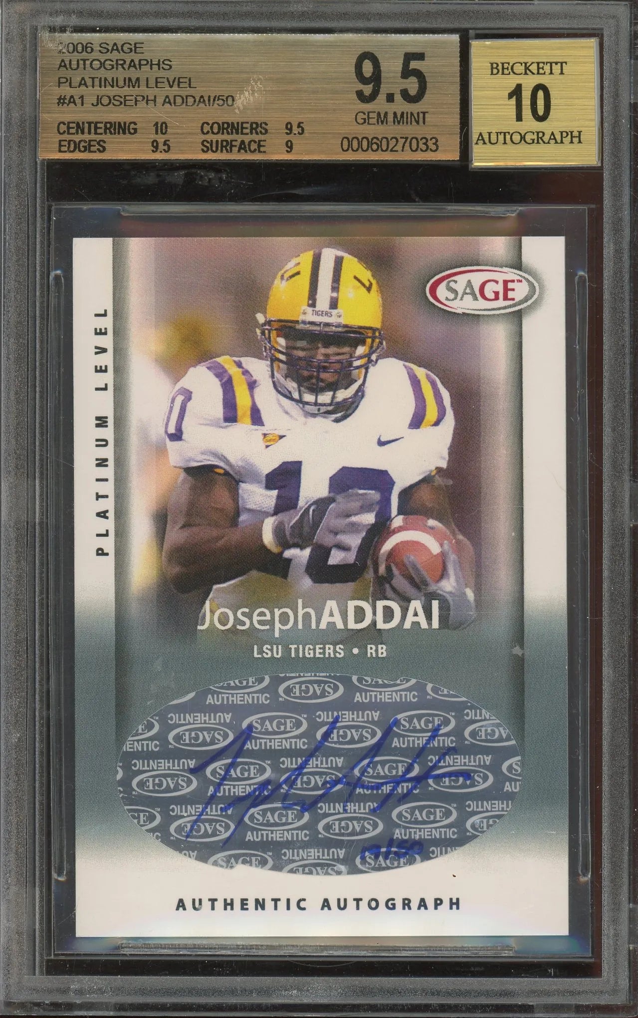 Joseph Addai (LSU Tigers) 2006 SAGE Autographs Platinum Level Rookie Football Card #A1. This card has been graded Gem Mint 9.5 Auto 10 by BGS (Beckett Grading Services)!