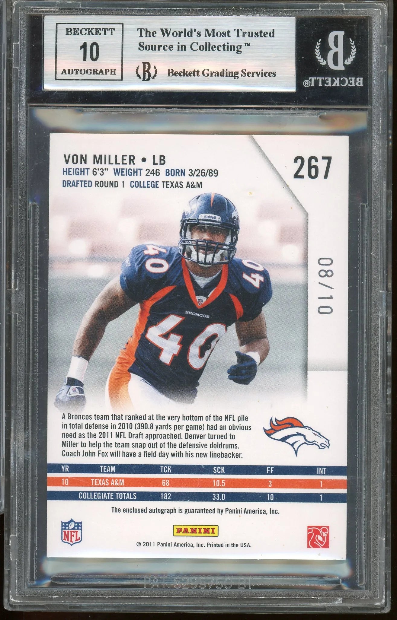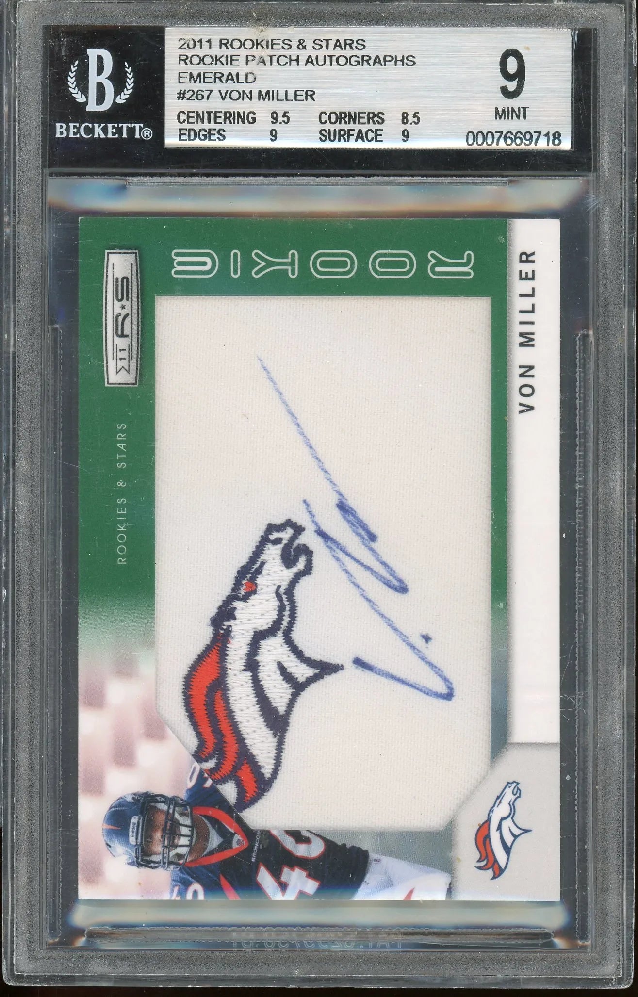Von Miller 2011 Panini Rookies & Stars Emerald RPA #267 RC – #8 Of 10 – Graded Mint 9 (BGS) With Graded 10 Autograph - Rookie Card