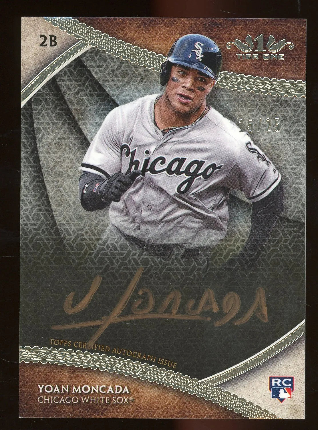 This is a Yoan Moncada (as a member of the Chicago White Sox) 2017 Topps Tier One Breakout Bronze Autograph Baseball card, Serial-Numbered #15 of 25. This card has been hand-signed by Yoan Moncada. This card has not been graded.