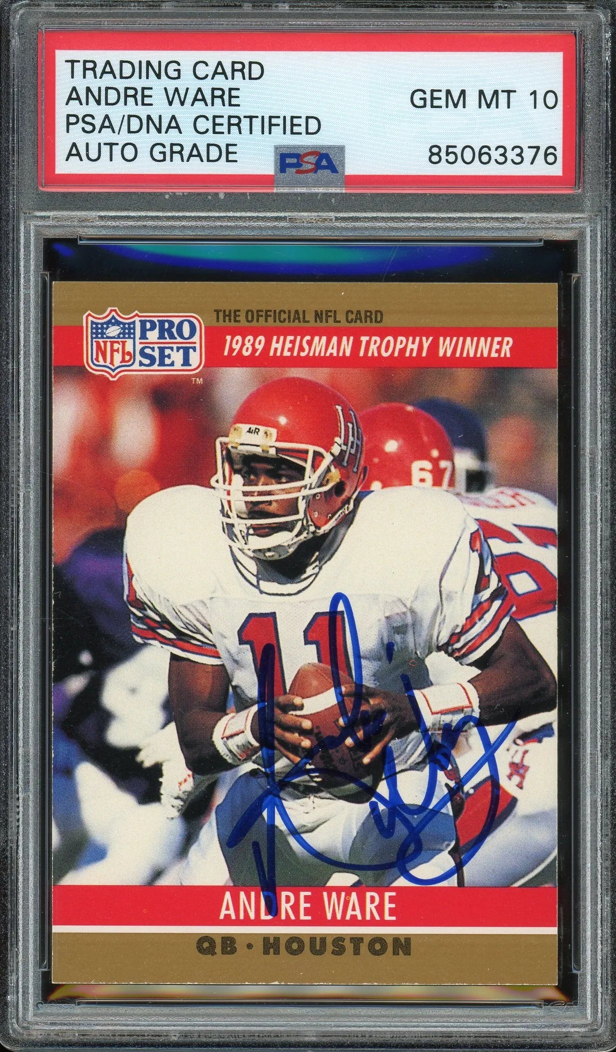 This is an Andre Ware (as a member of the Houston Cougars) Signed 1990 Pro Set Heisman Winner Rookie Football card. This card has been hand-signed by Andre Ware. This autograph has been graded PSA Gem Mint 10.