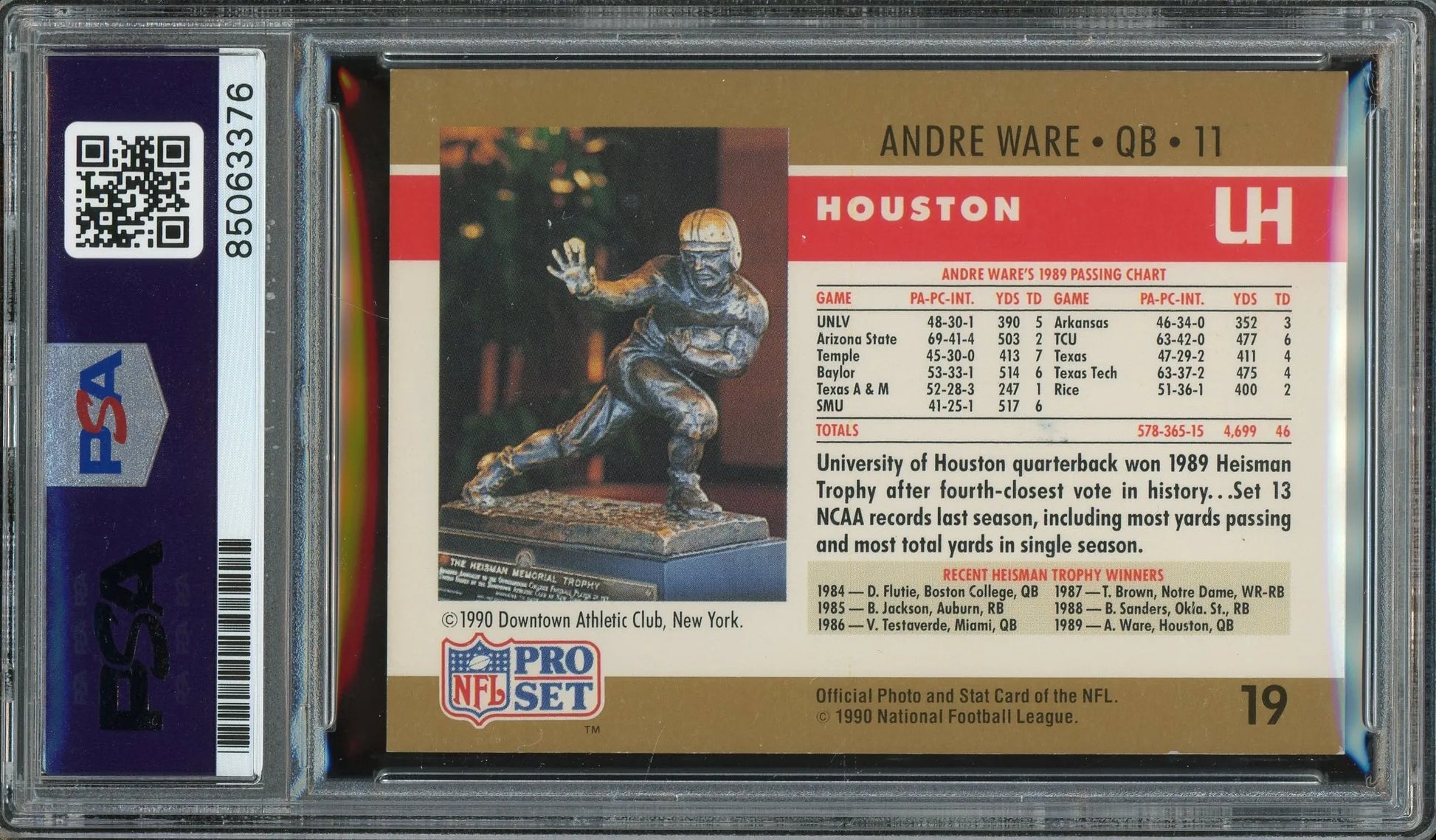Andre Ware Signed 1990 Pro Set Heisman Winner #19 RC – Auto Graded 10 (PSA) - Rookie Card