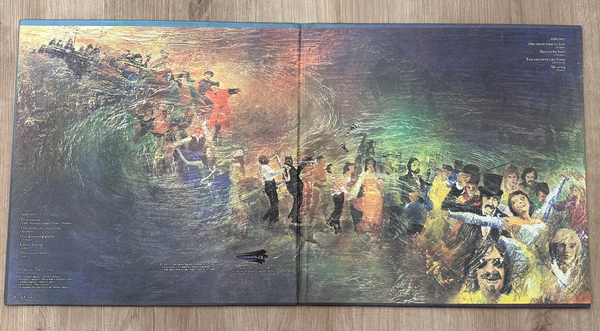Vinyl record album measures approximately 12" x 12" in size. Hand-signed by Justin Hayward, Ray Thomas (D. 2018), Mike Pinder, Graeme Edge (D. 2021) & John Lodge. Please note, record is included and album cover shows signs of wear.